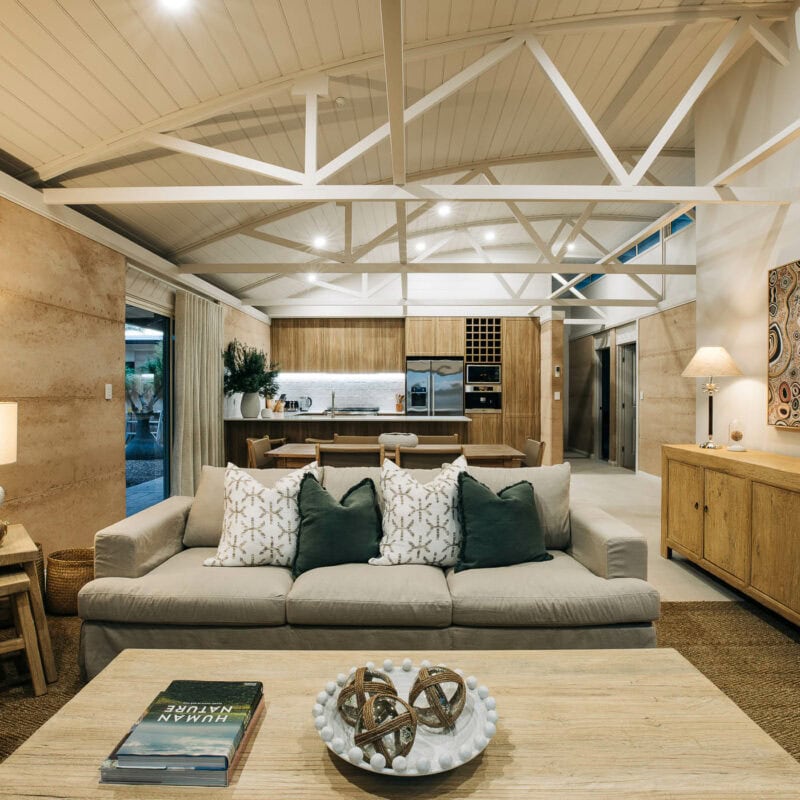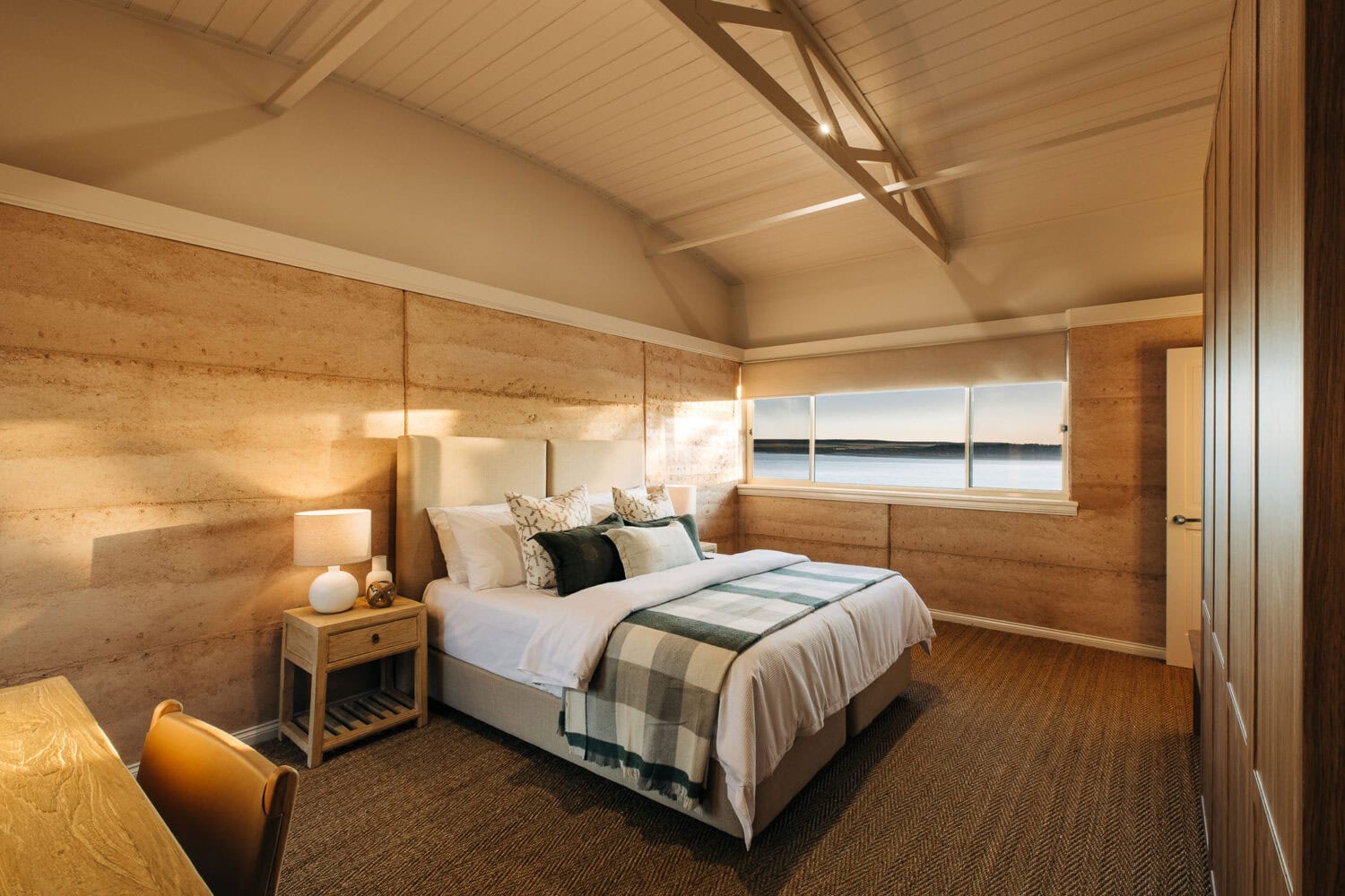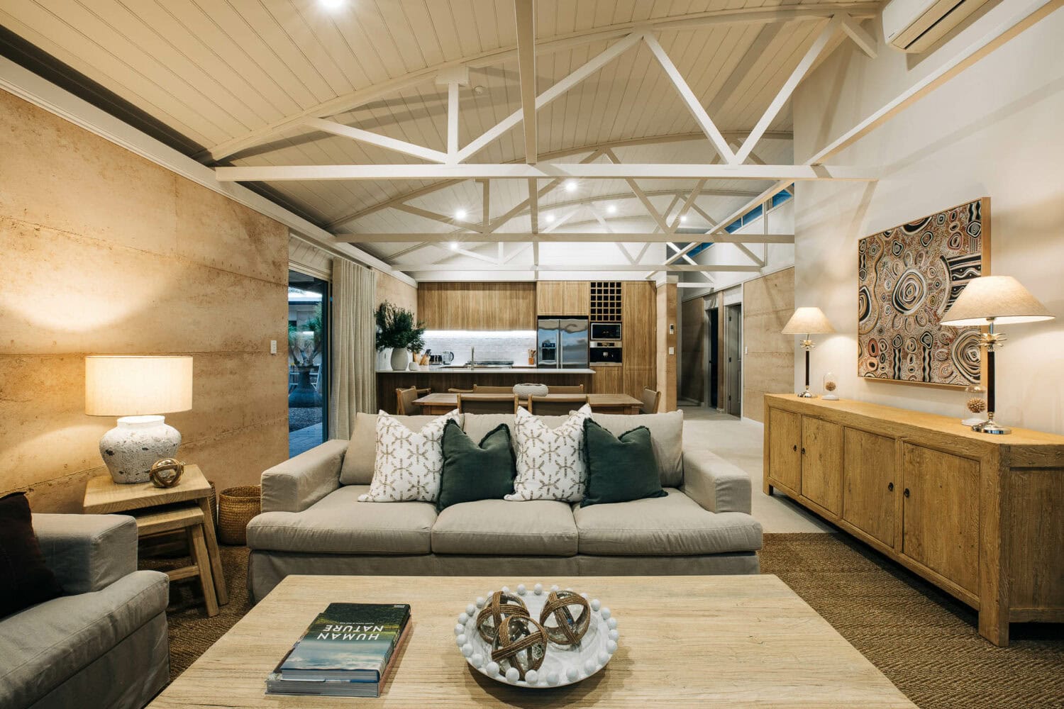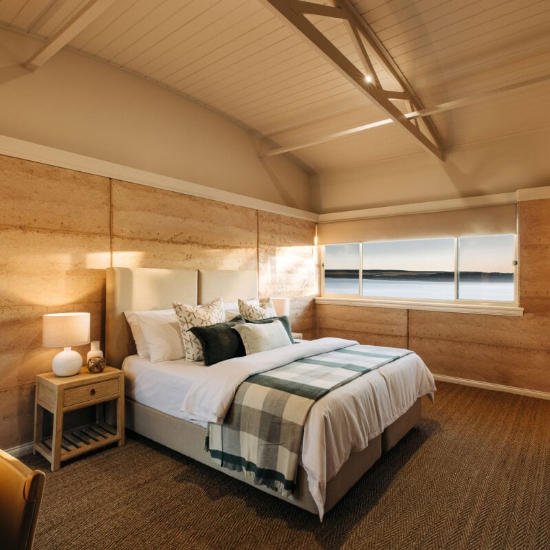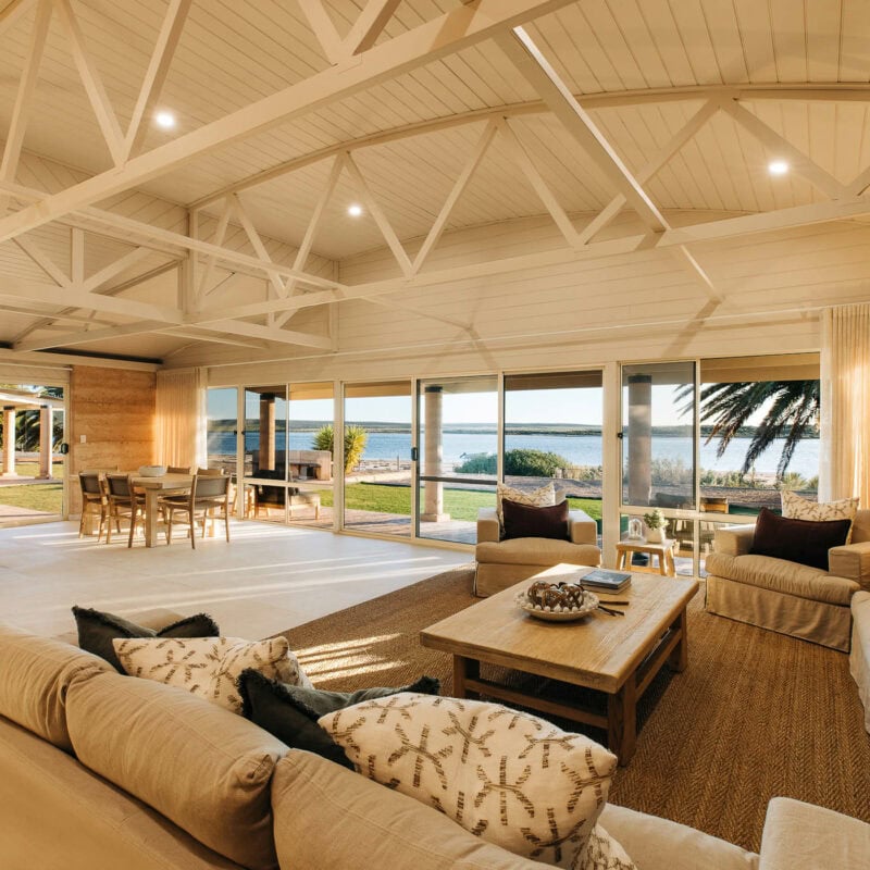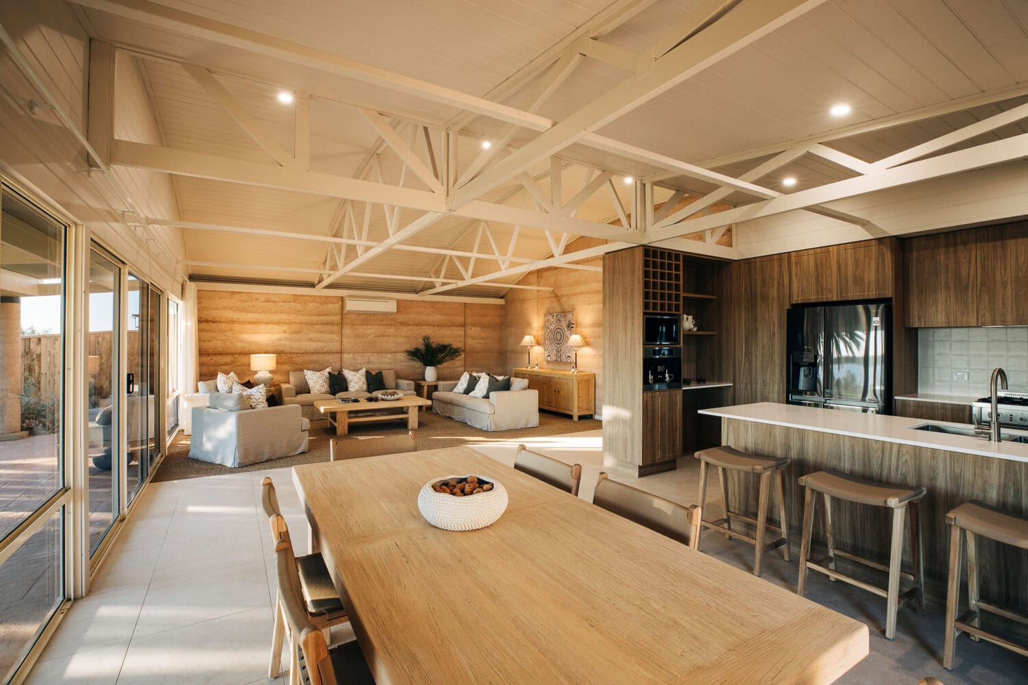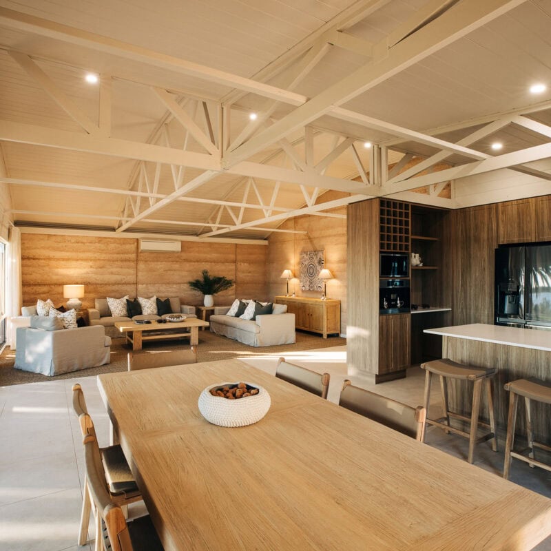 Set along the sandy shoreline of Baird Bay, the all-inclusive lodge offers a peaceful retreat that balances comfort with a strong connection to place. Designed for small groups or private buyouts, the two self-contained villas – one three-bedroom and one four-bedroom – are linked by a shared outdoor lounge, BBQ area, and pool. Natural materials, local artwork, and thoughtful touches reflect the character of the region, creating an atmosphere of quiet, understated luxury.