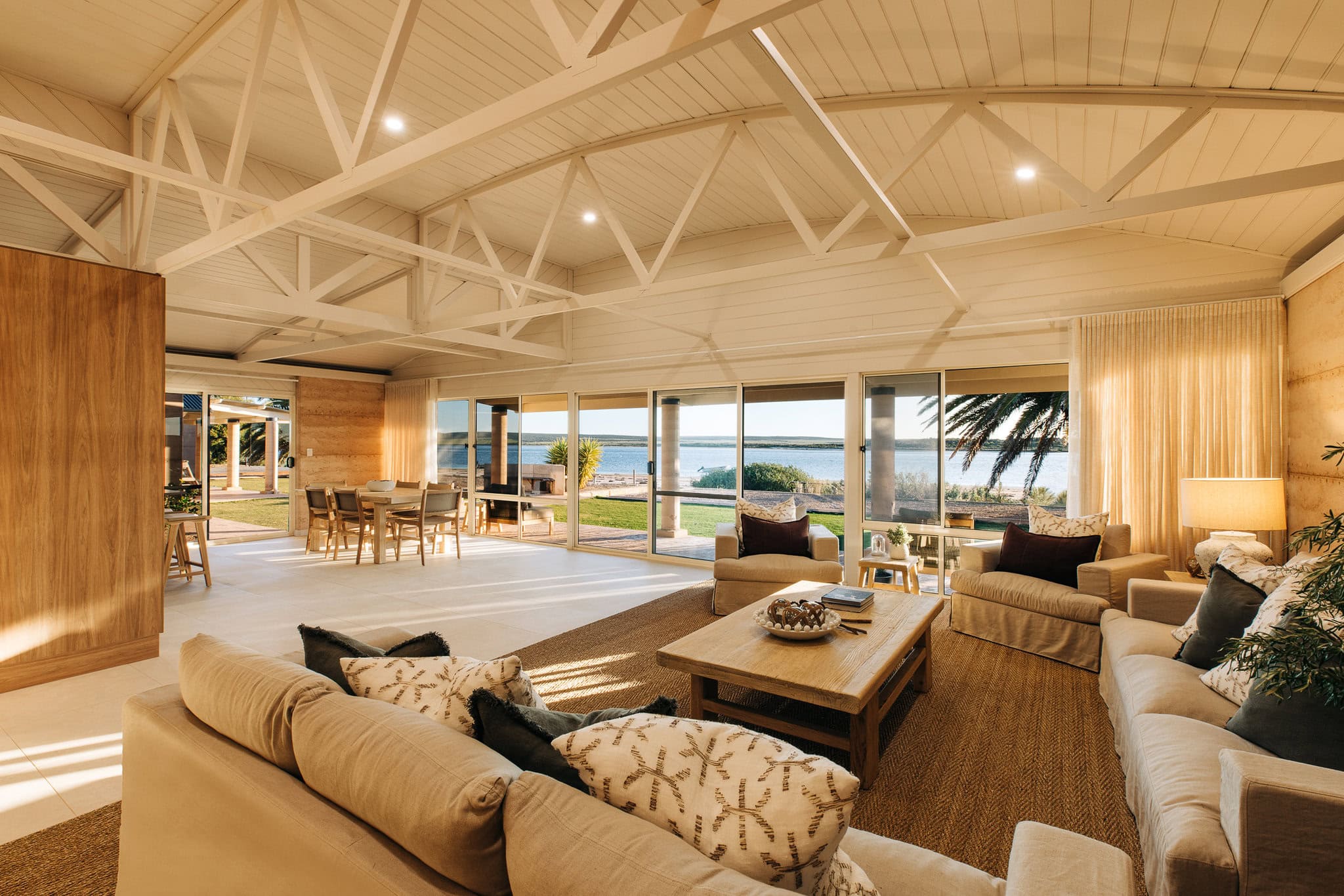 Set along the sandy shoreline of Baird Bay, the all-inclusive lodge offers a peaceful retreat that balances comfort with a strong connection to place. Designed for small groups or private buyouts, the two self-contained villas – one three-bedroom and one four-bedroom – are linked by a shared outdoor lounge, BBQ area, and pool. Natural materials, local artwork, and thoughtful touches reflect the character of the region, creating an atmosphere of quiet, understated luxury.